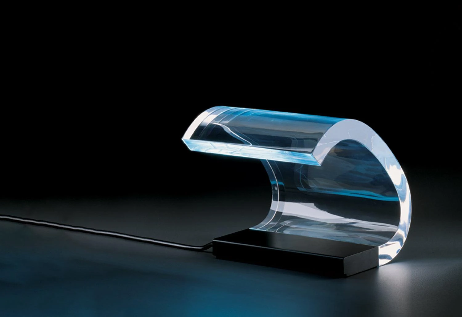 Designed in 1962 by Joe Colombo, the Acrilica 281 table light is ‘more a work of kinetic art than a lamp’. The significant curve is made from acrylic and its thickness and curve meant that due to its conduction properties, the light from a fluorescent lamp contained within the painted steel base moves through the transparent body, eventually lighting the head in an incredible way.
