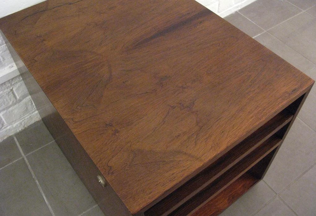 The design was restrained but bold, with strict, box-like carcass and inset drawers. Using selected rosewood veneers, the drawer set is austerely modernist, yet a decorative and functional piece of furniture.