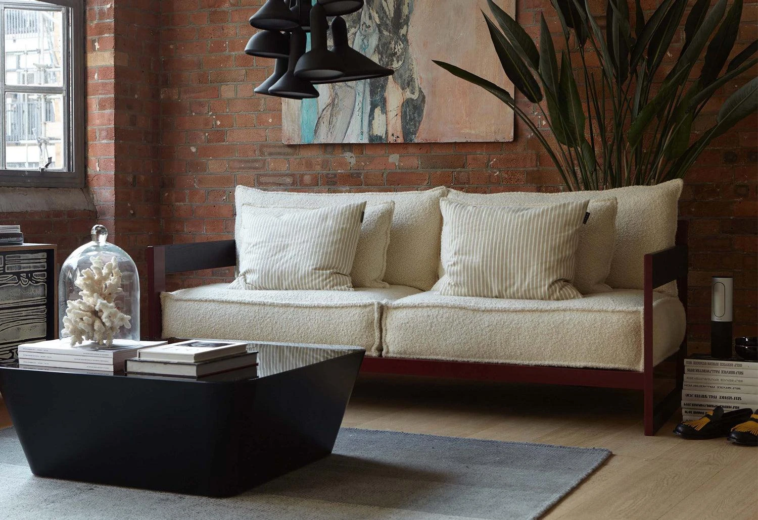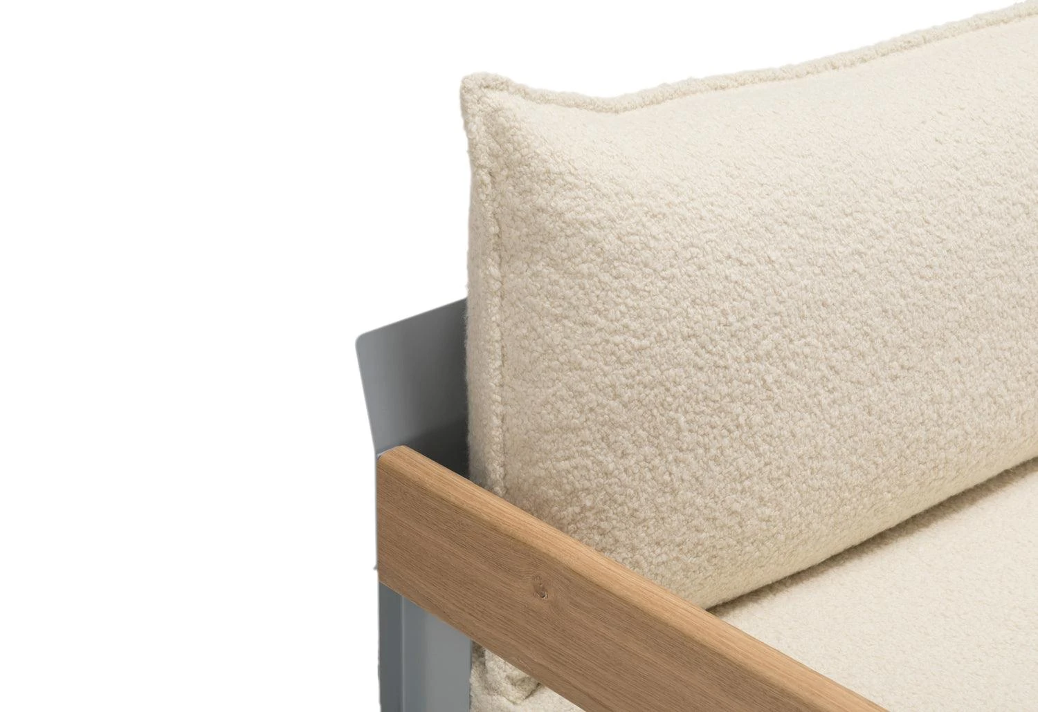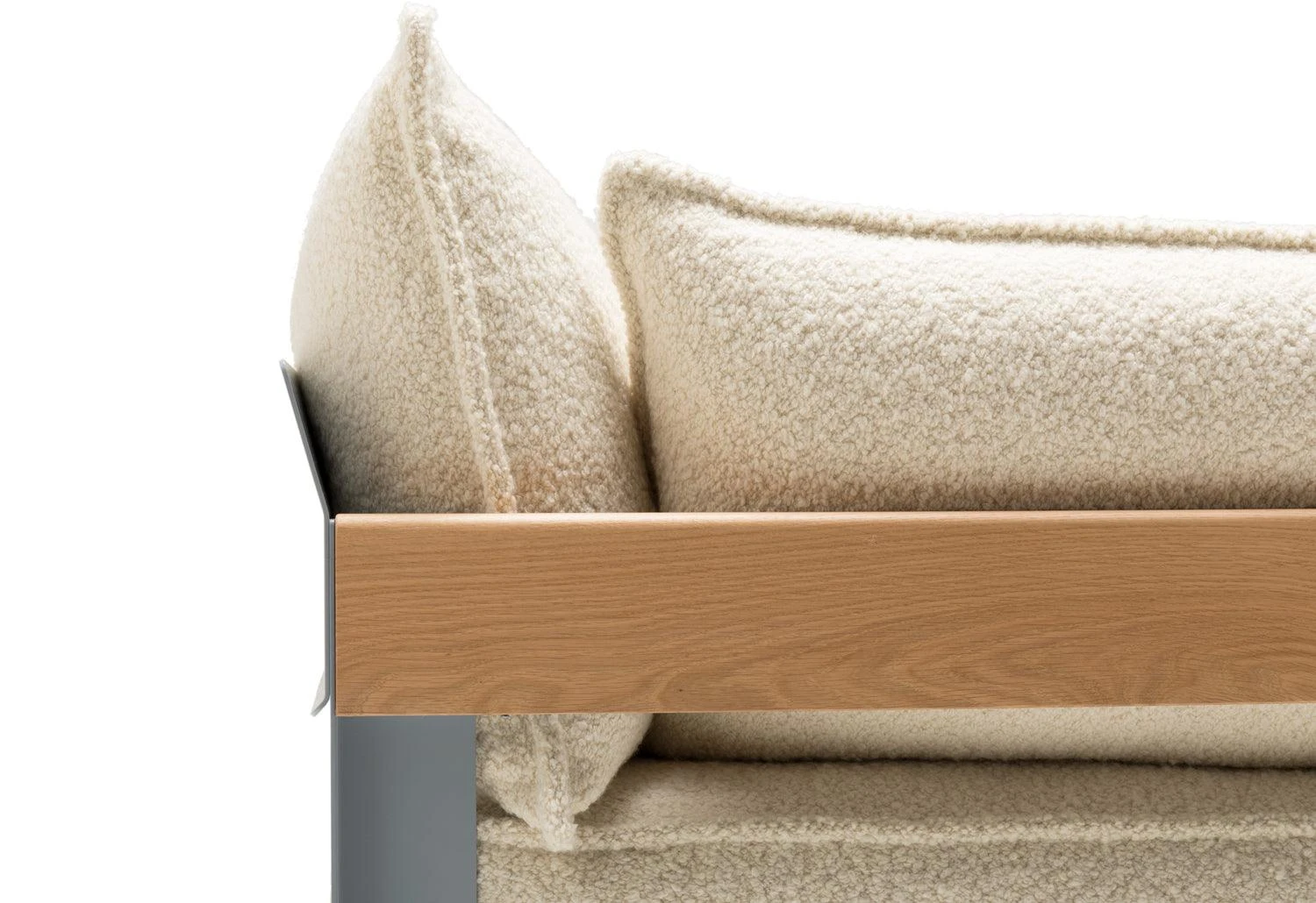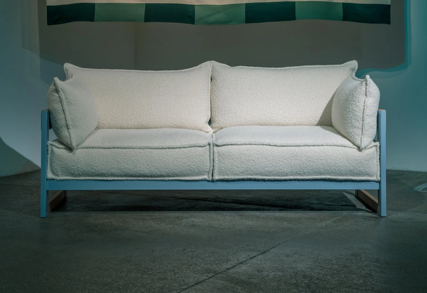A powder-coated metal frame offers bold panels of colour but with a slim side-profile that adds lightness to each piece. This helps to offset the sofa’s generous depth and cushioning and allows for a greater seating area compared to its footprint.