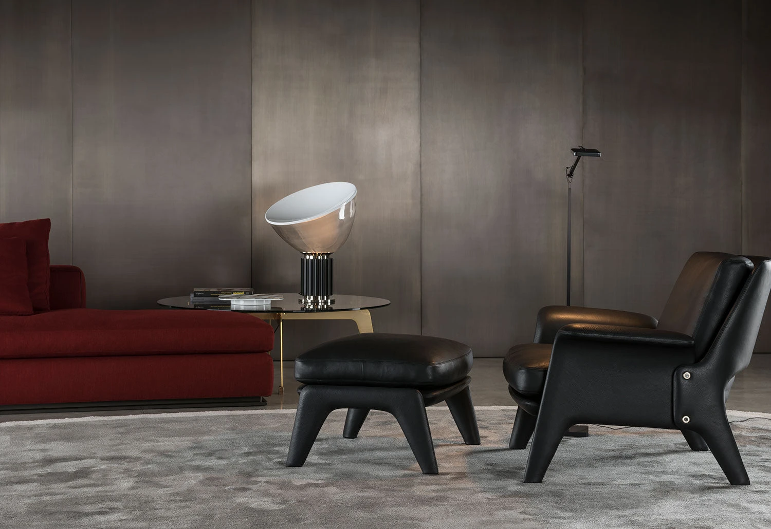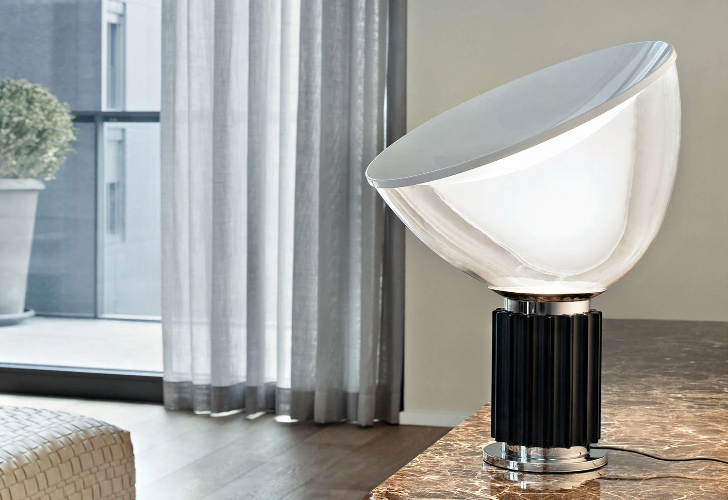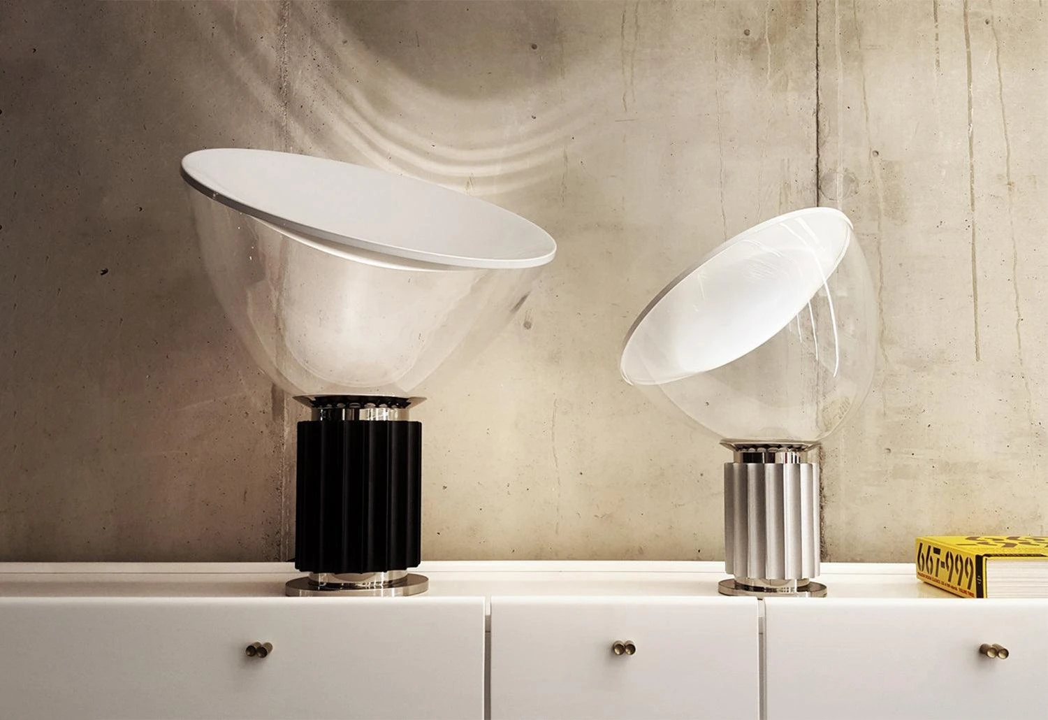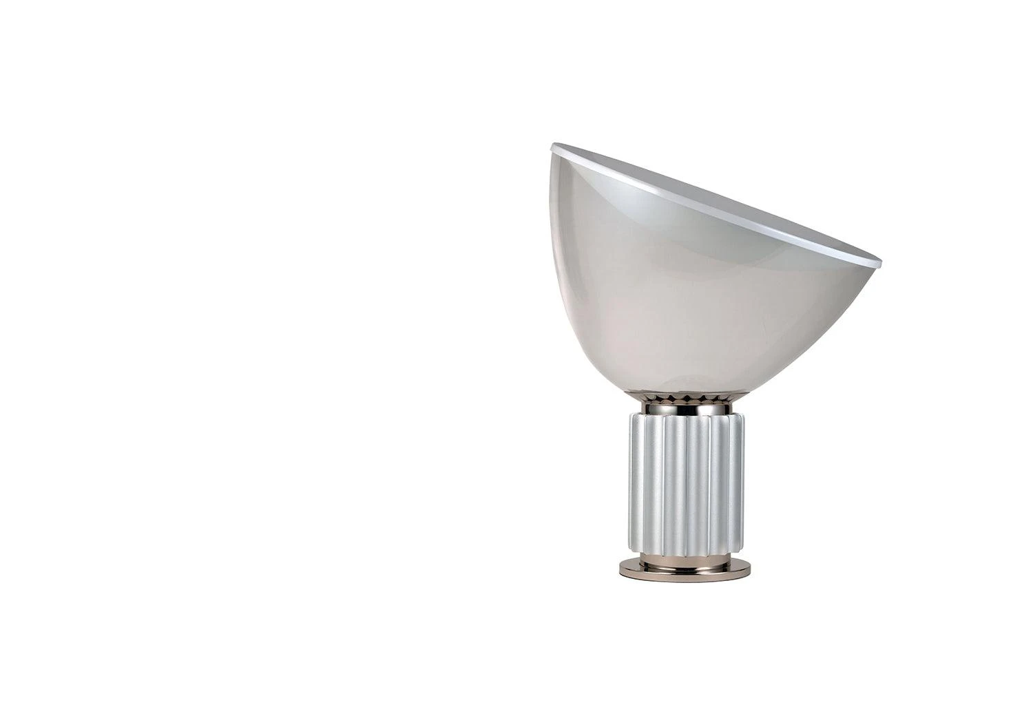 Taccia is a classic of Italian lighting design by Achille and Pier Giacomo Castiglioni. Designed in 1958, Taccia’s signature dramatic diffuser was originally made of transparent plastic but in 1962 Flos produced a more heat-resistant version in blown glass.Â