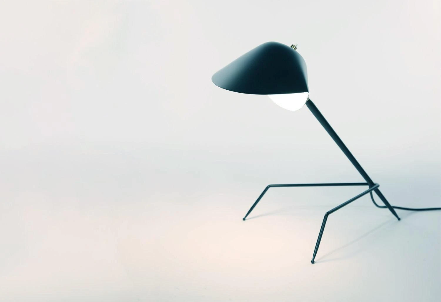 Serge Mouille’s Tripod desk lamp is characterised by its shell-like shade and unique tripod base, providing an animated, insect-like form. Like many of Mouille’s lamps of this era, the desk lamp has a kinetic quality, conjuring a sense of movement.