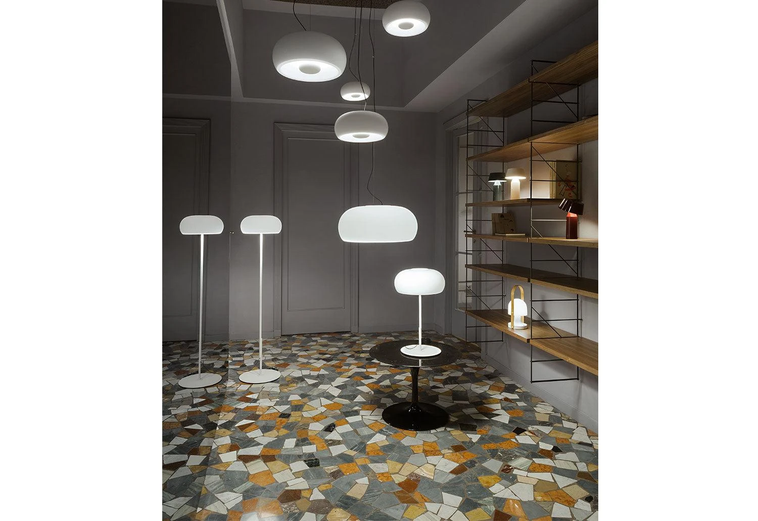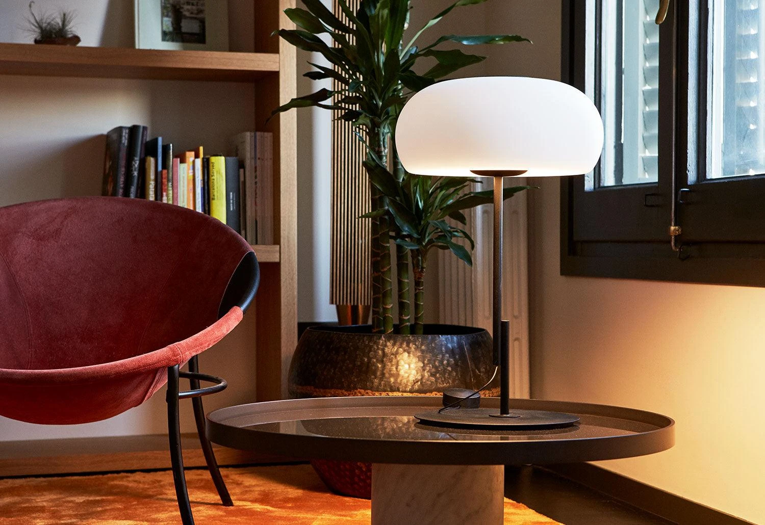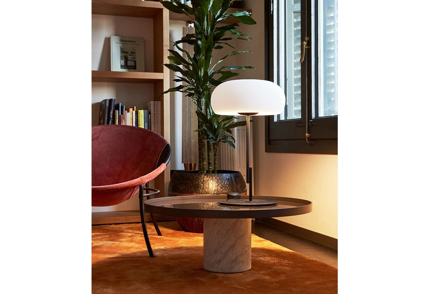 Vetra takes the traditional glass blown pendant design and packs it with a surprise. The table lamp uses a completely closed glass diffuser as reflector while creatively placing the light source outside. This advance design allows the lamp to produce light without any glare. Much of the light is directed downwards while its design allows the rest of the light to filter inside the shade subtly lighting it.