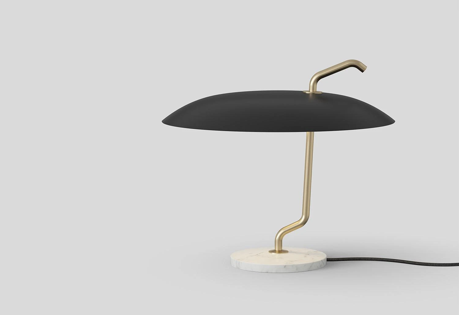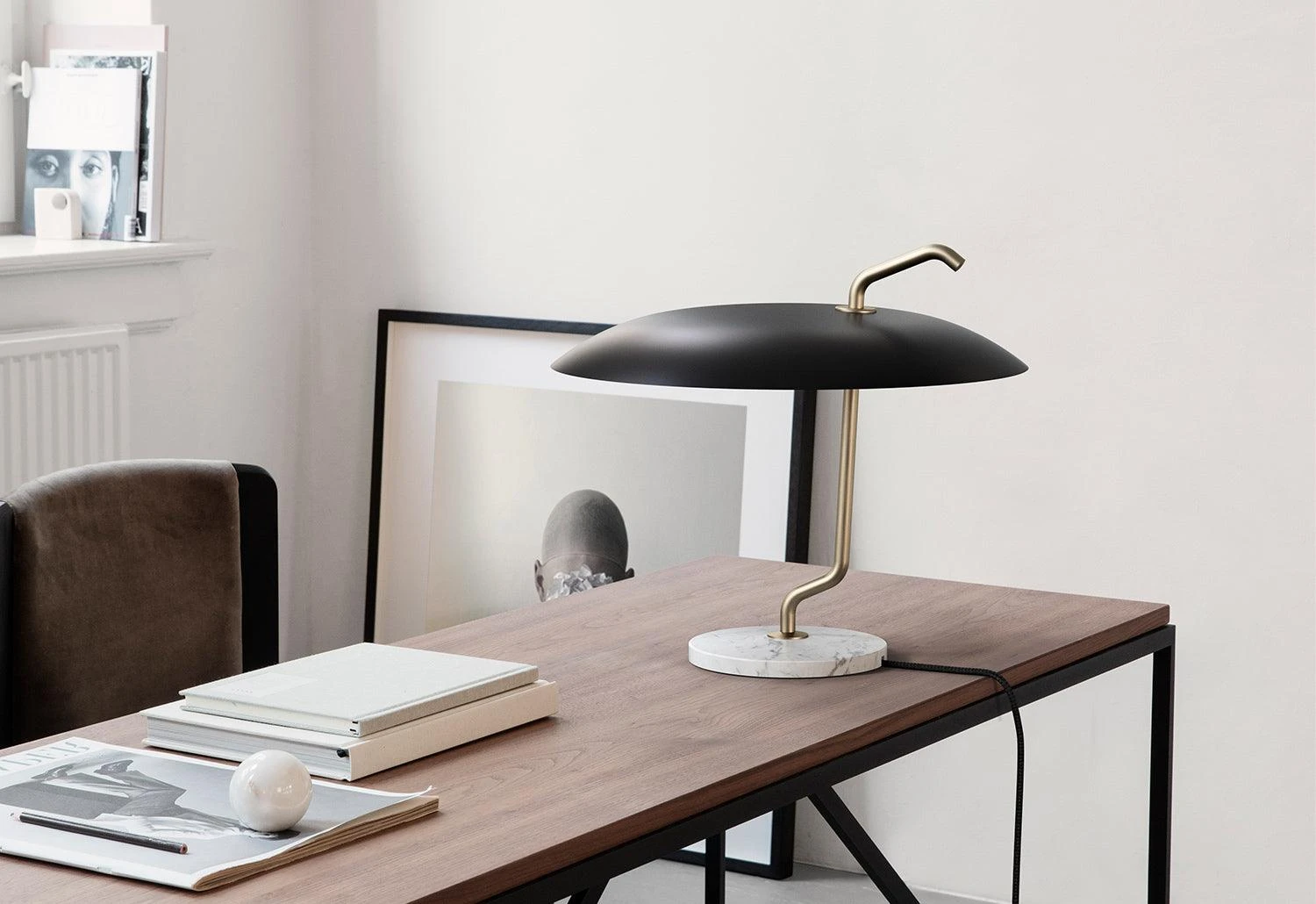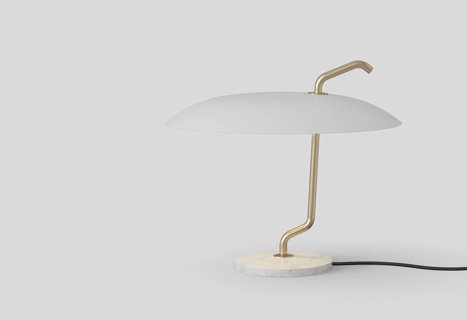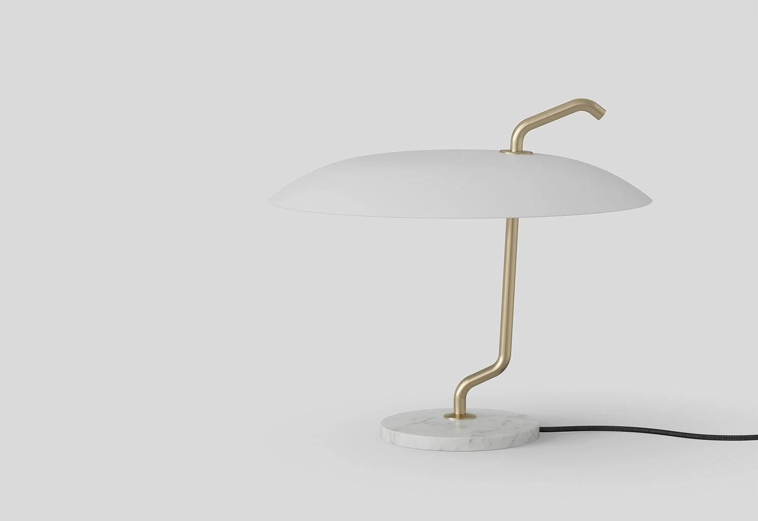 Model 537 table lamp is a perfect modern table lamp to create a cosy reading corner. The desk lamp from Astep is a result of the combination of playful, ingenious design and high-end material. The large aluminium reflector available in black or white finish carefully balances on a stem that sits on an elegant marble base. The stem protrudes through the reflector providing a playful look while serving as a practical handle.