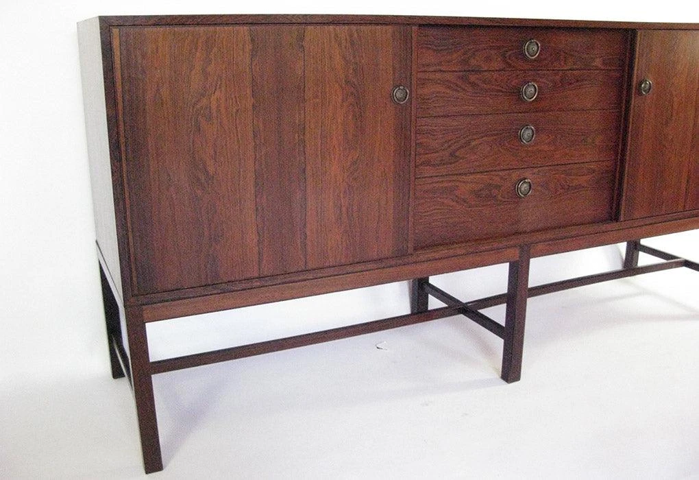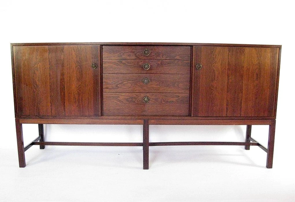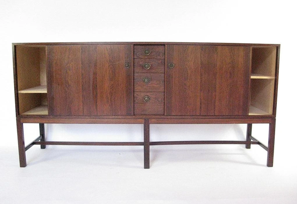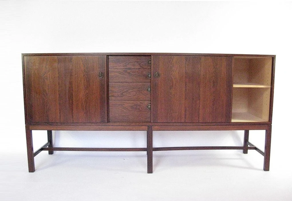 This cabinet reflects typical philosophies and design elements from twentieth-century Danish cabinet makers. There is a marriage of historical and classical features in its simple modernist outline. The leg structure, with six uprights and connecting rails, can be traced to 17th Century dressers and a similar configuration was used by Kaare Klint during the 1930s in his cabinets for Rud. Rasmussen. The pulls for the drawers and doors pay homage to regency furniture designs.