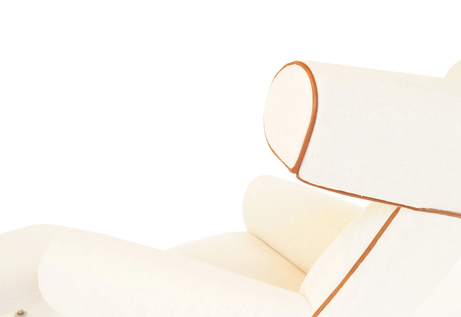 The construction of the timber frame is complex and the upholstery is designed to express expansive shapes of the seat, back, arms and ‘horns’.