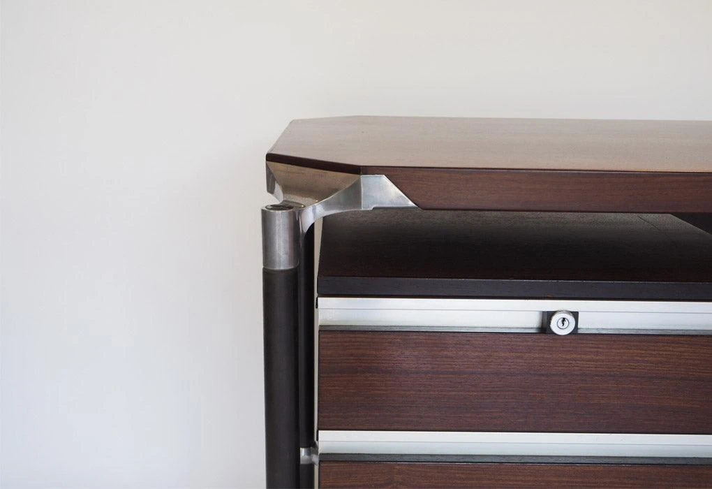 The desk designed by Ico and Luisa Parisi typifies their architectural approach towards furniture design. The outline is strong, and the method of support and fixing clearly defined. Combining solid and veneered rosewood with cast aluminium components, the desk was made to extremely high standards by the Rome based manufacturer M.i.M. This example has three lockable drawers with key and has been restored.