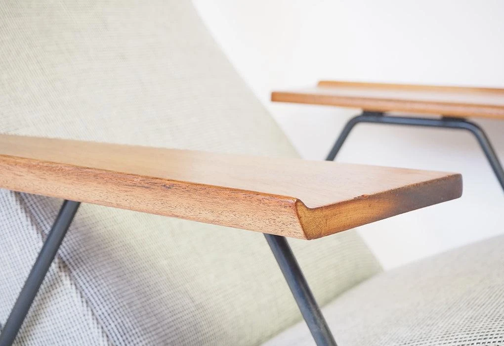 The seat employed latex webbing, rather than traditional springs, which allowed for a slimmer profile without forsaking ergonomic comfort. The fine frame sits outside the seat and clearly defines the structural make-up for the chair. Another signature feature is the wide, sculptural armrests, in solid wood, which provide support for the user, whilst also acting as small tables.