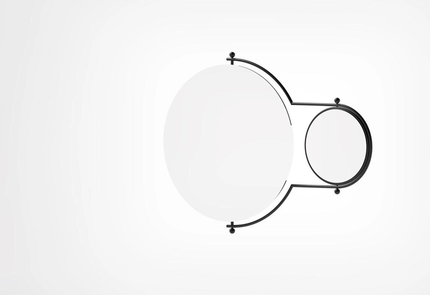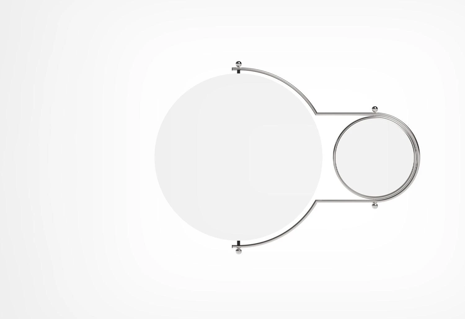 A classic of 1980s British design, the Orbit mirror combines a large wall-mounted circular mirror with a smaller vanity mirror positioned on a swing arm much like a satellite orbiting a planet.Â