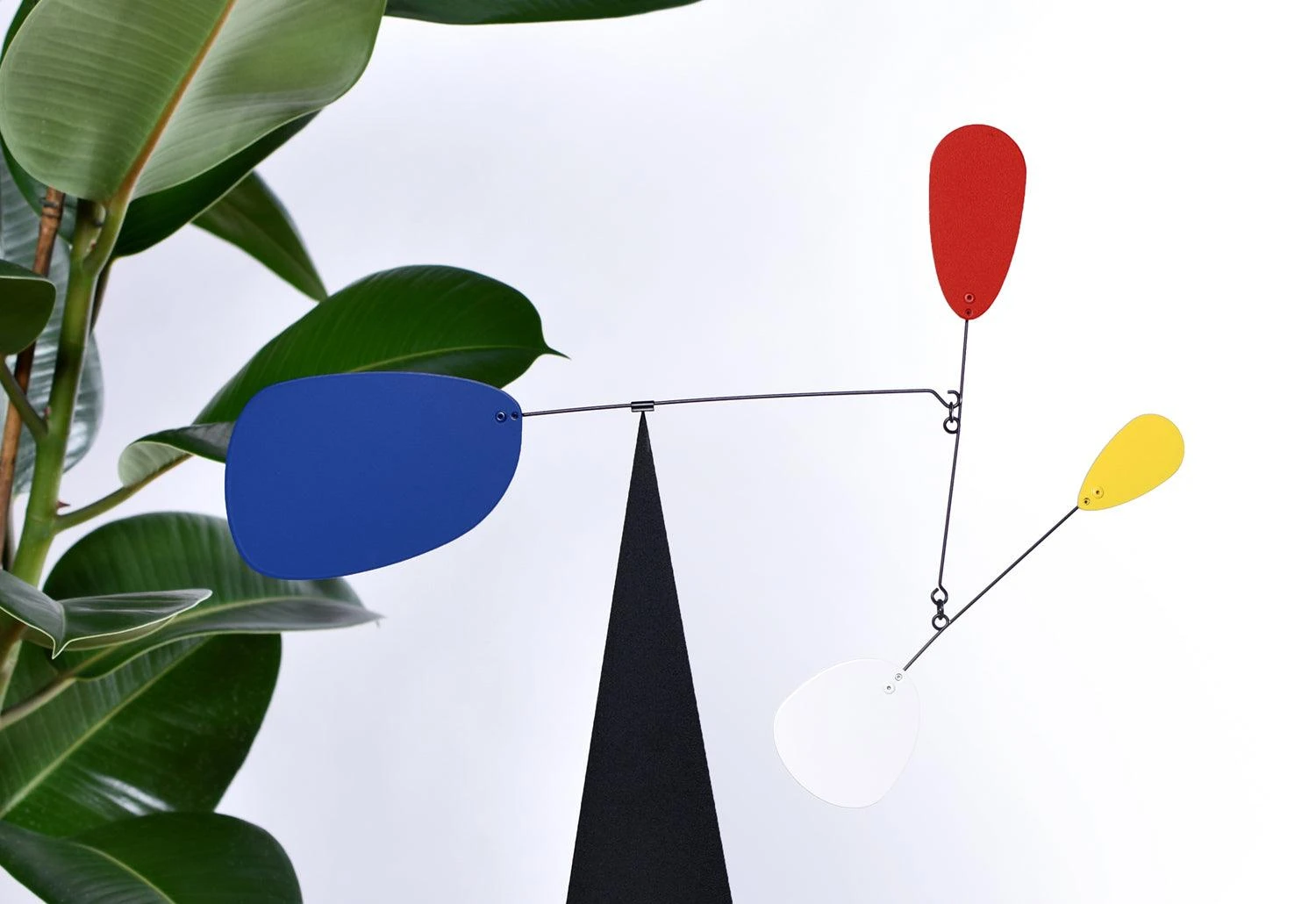 With a jet black base and arms, and primary-coloured paddles in red, white, yellow and blue, the Paris tabletop mobile brings to mind the bold paintings of Dutch artist Mondrian.