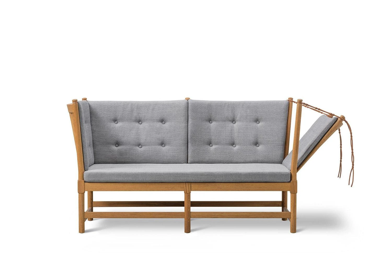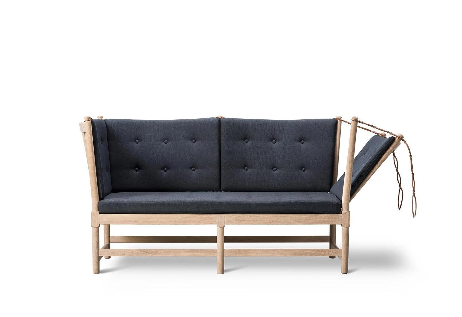 The Spokeback sofa with a side that can be lowered by characteristic leather straps is one of Børge Mogensen´s most popular models. The sofa was designed in 1945 but the combination of a classic two-seat sofa with English daybed and French chaise long was too sophisticated for post-war taste and it did not go into production until 1963. Since then it has been copied endlessly.