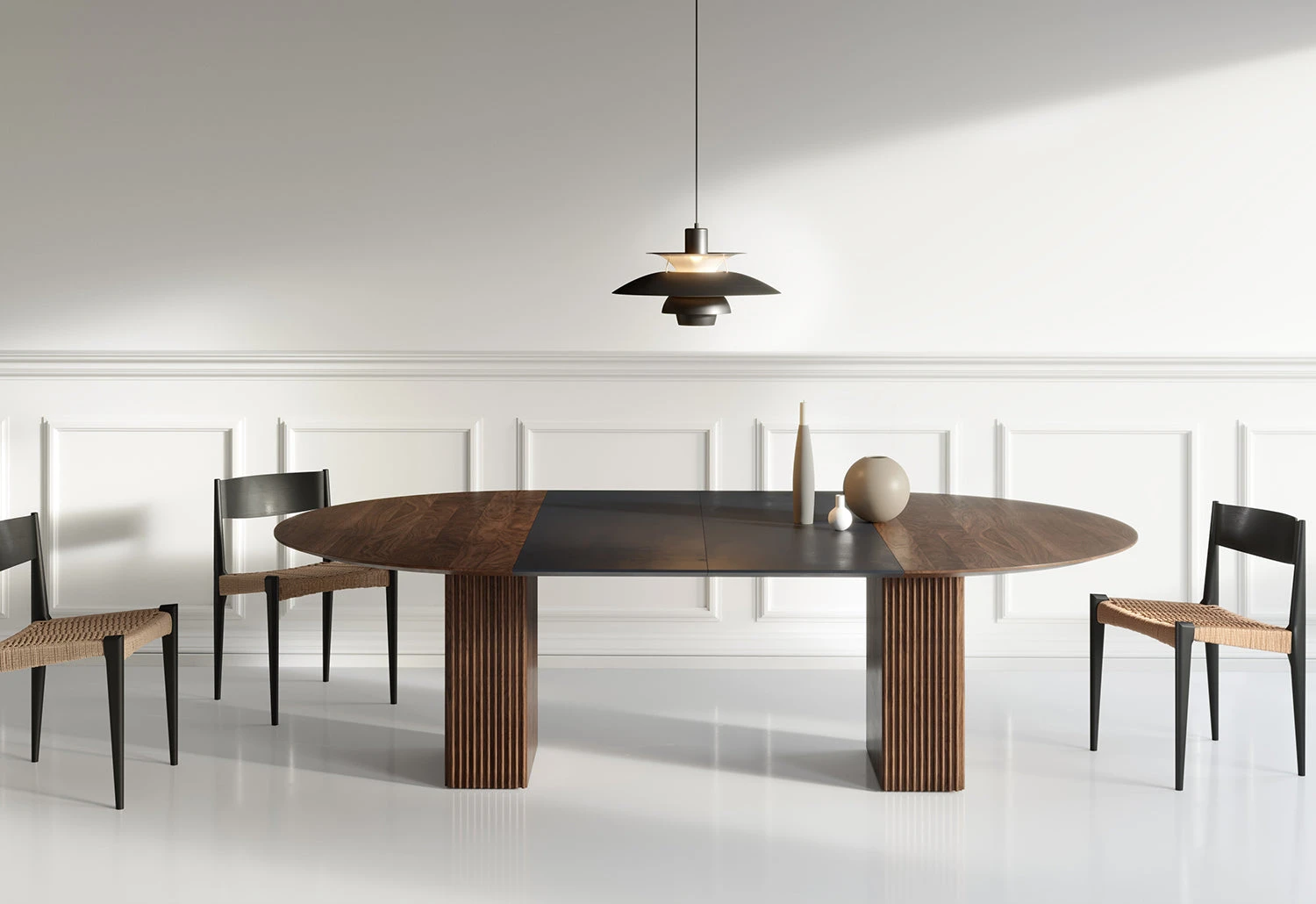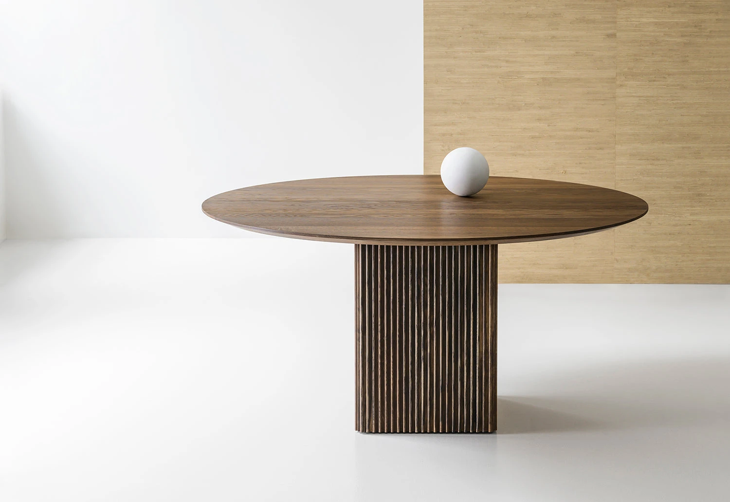 The table can accommodate up to two extension leaves – allowing for a truly versatile and adaptable dining table. The solid-wood cube base, accessorised by vertical grooves, splits in two when adding an extension leaf – acting as two separate legs.