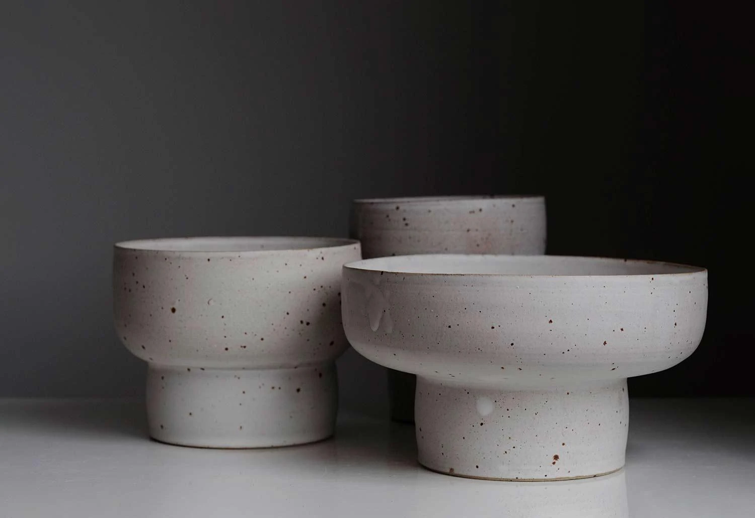Tom Crew is a London-based potter, working in mottled grey and black clays to create a variety of hand-thrown pieces. Each bowl is inspired by human form and touch, double dipped in a soft matt dolomite glaze, allowing some of the clay’s surface to permeate the finish. Due to their handmade nature, each pedestal bowl is unique in shape and size.