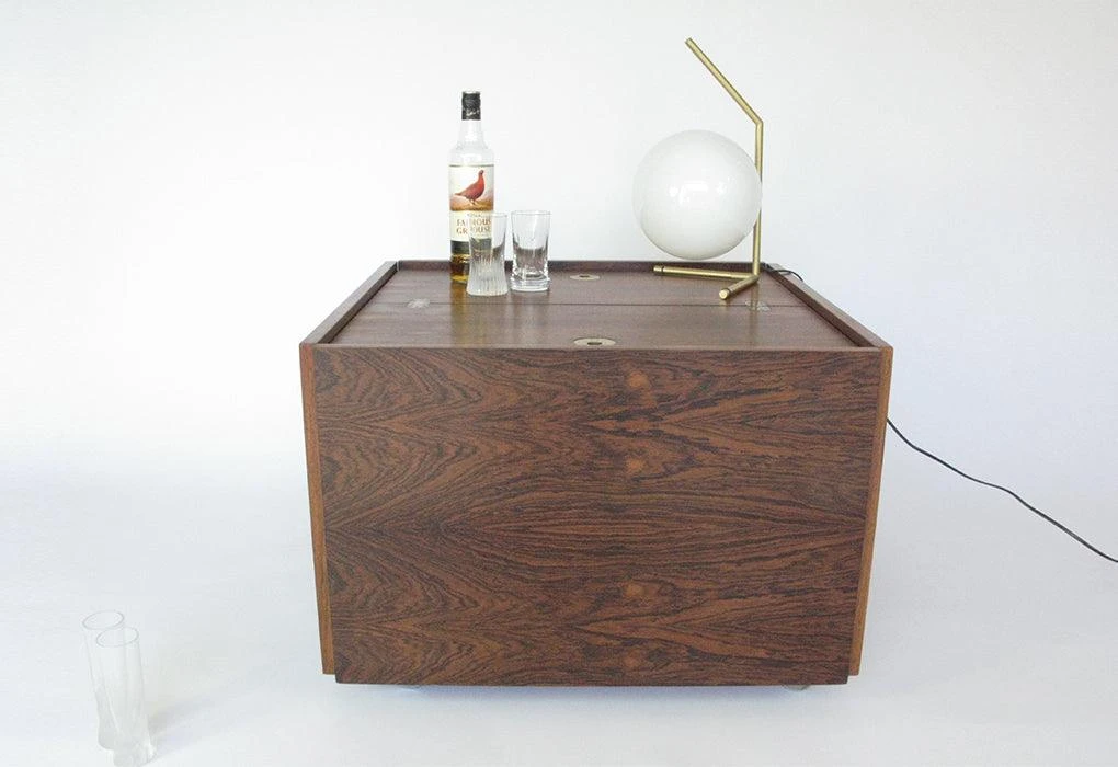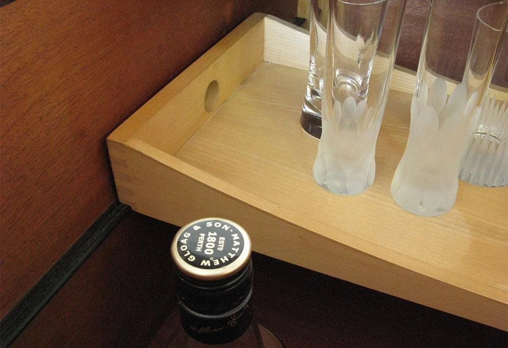 The corner detail of an apparently open joint provided a design language to the collection, and the quality of production was further enhanced through recessed brass hinges and pulls.