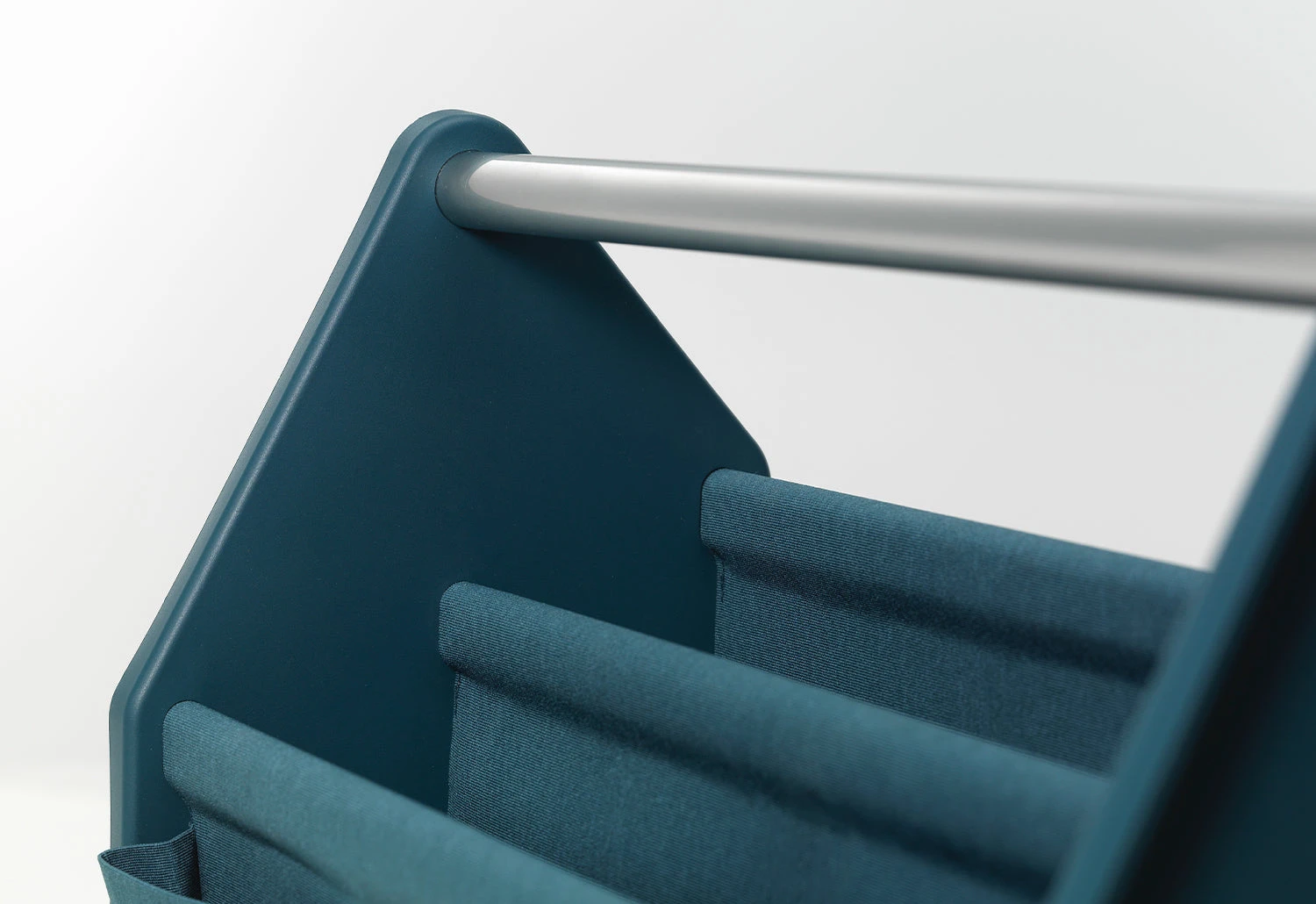 The box comes with a simple sturdy construction with two recycled plastic side panels joined by aluminium tubes. The top aluminium tube can be used as a handle. A structure of textile panels with welded seams is suspended on five tubes to form the compartments.