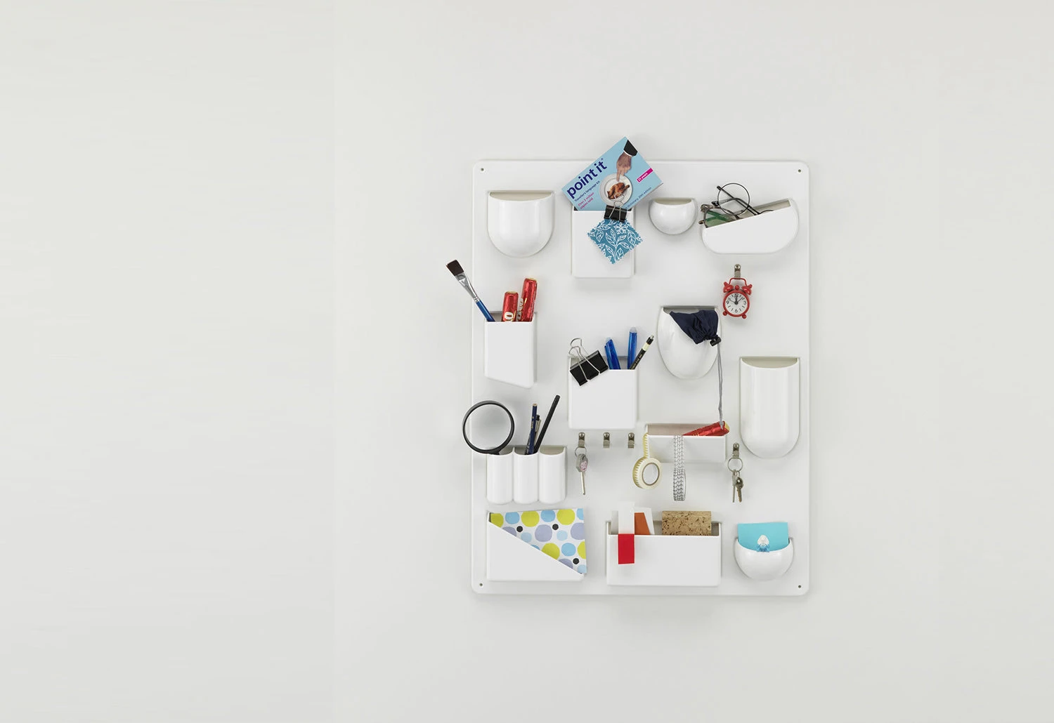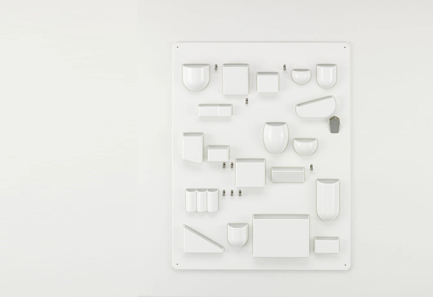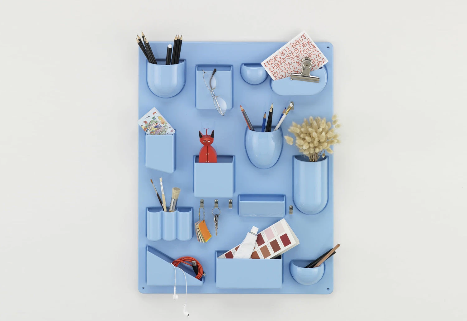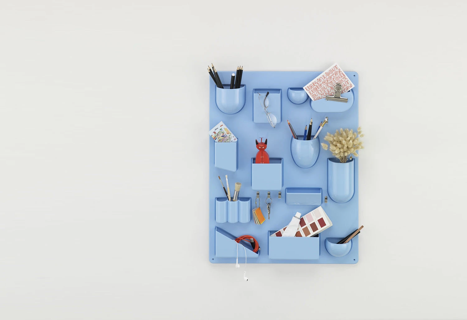 Uten.Silo is a wall storage solution from Vitra designed by Dorothee Becker. Available in two different sizes, the storage system features storage of different shapes and sizes.