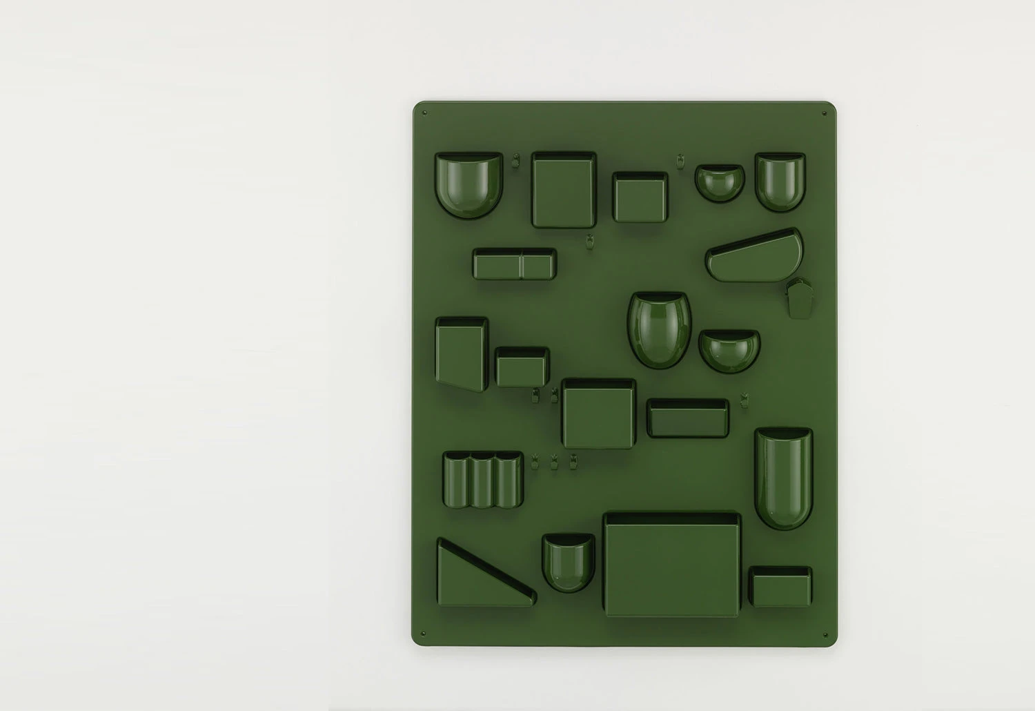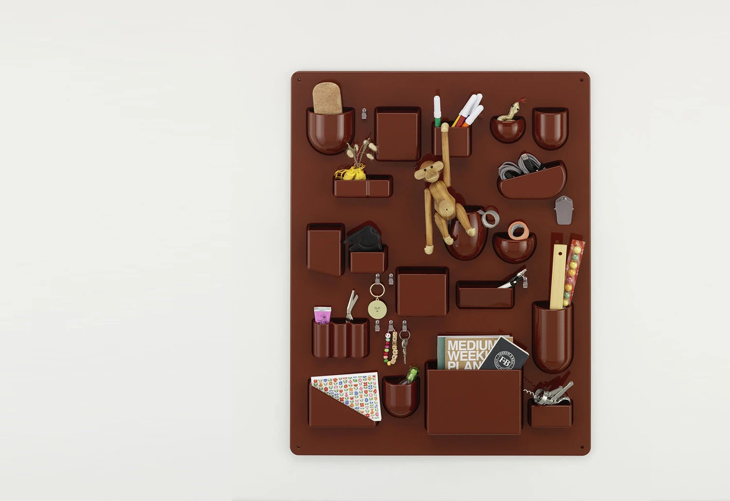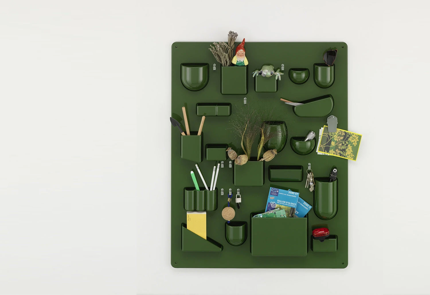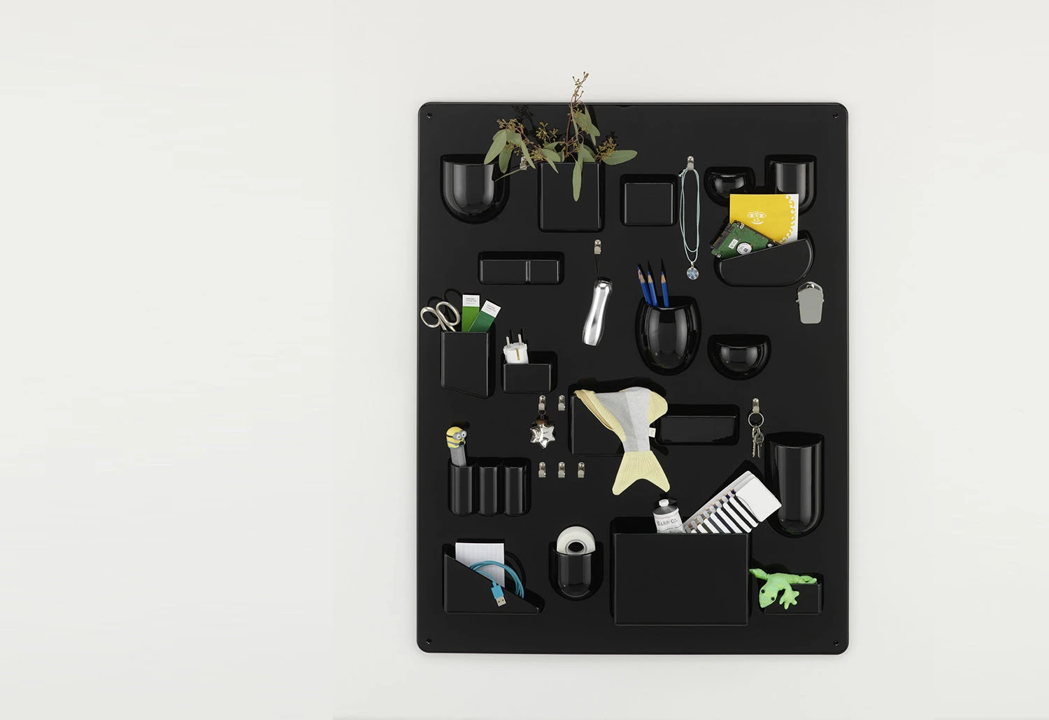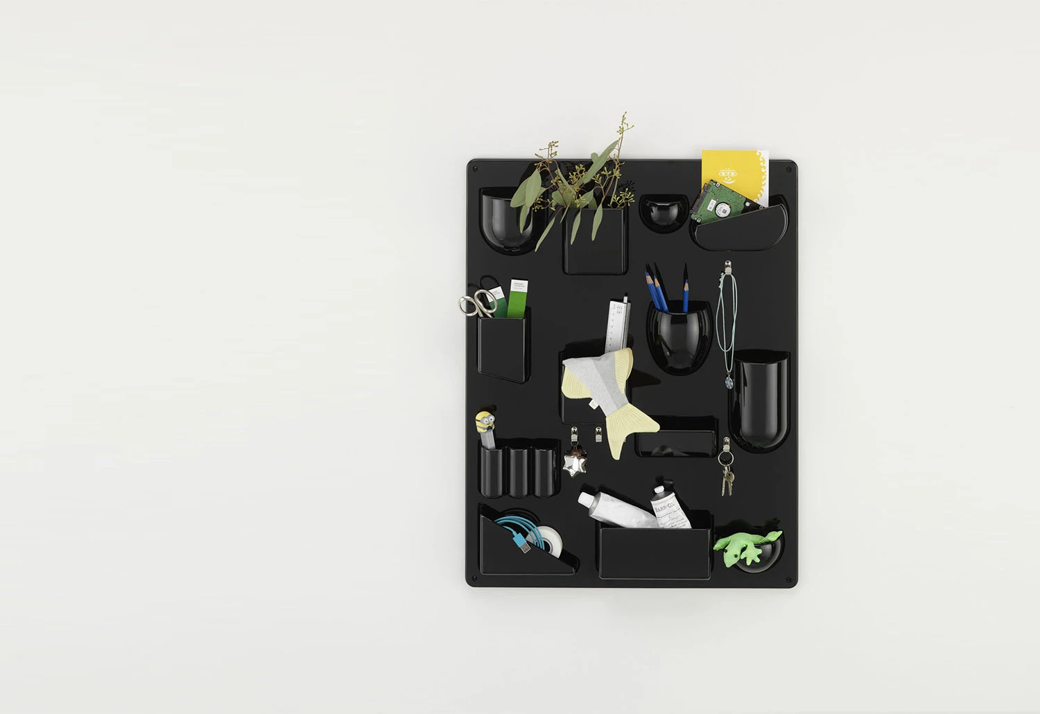 Uten.Silo is a wall storage solution from Vitra designed by Dorothee Becker. Available in two different sizes, the storage system features storage of different shapes and sizes.